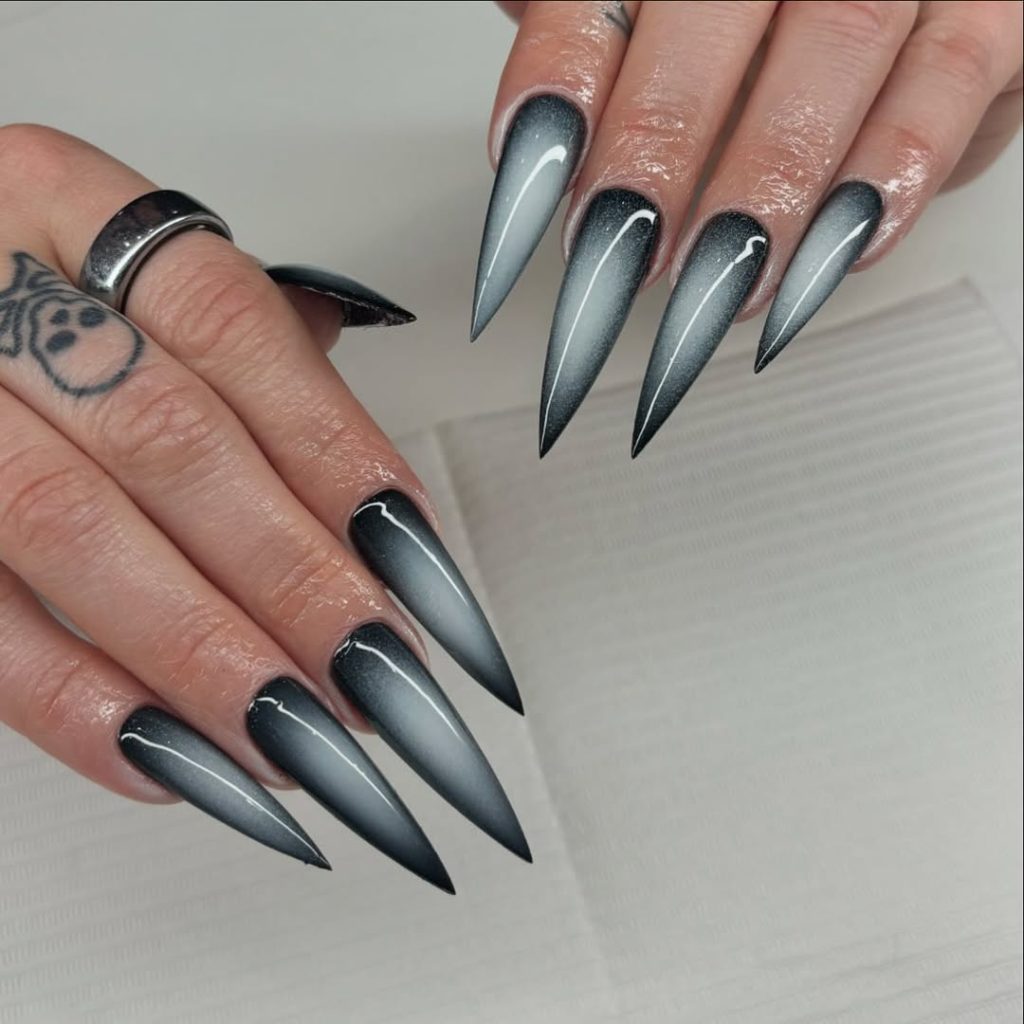 A glacial gray aura stretches along dramatic stiletto lengths, fading to charcoal points. It’s power-dressing for your hands—editorial yet wearable if your wardrobe leans monochrome. Keep jewelry sleek and metallic; the linear gradient loves mirror finishes and clean tailoring.