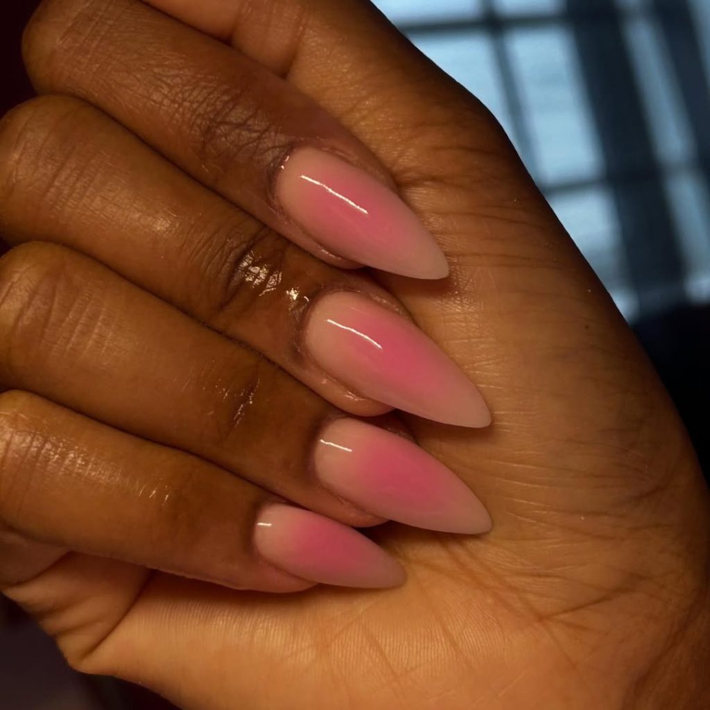 A creamy pink center fades into charcoal black at the borders, stretched over long, tapered almond tips. The contrast is striking yet soft, like blush lit from within. I recommend this to clients who want a “dress-up/dress-down” set that works with slip dresses at night and blazers at 9 a.m.