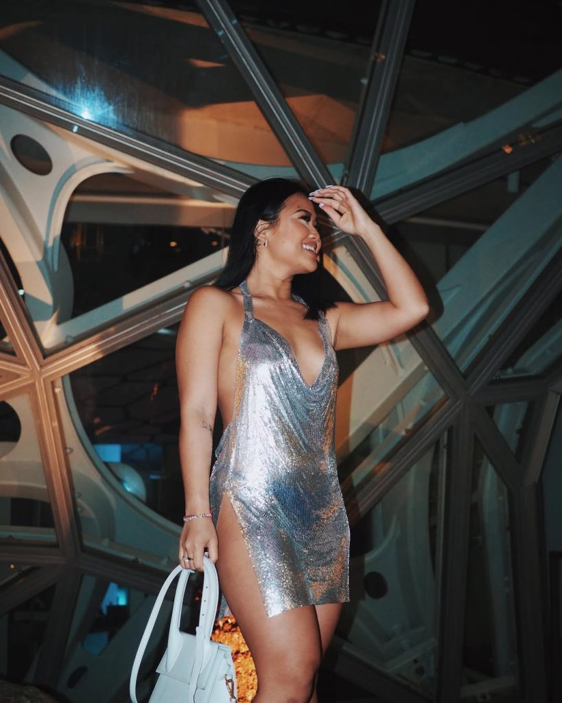 This look screams, “I have reservations, and I’m not home before 2 a.m.” It’s ideal for a 21st birthday, New Year’s in deep winter, or a Vegas night where every surface reflects light. To personalize it, play with your glam: chrome nails, graphic liner, or a bold red lip. Avoid over-styling the hair; sleek waves or a polished pony keep the focus on the dress. If you’re more classy than clubby, throw on a tailored black blazer and pointed pumps. For plus-size bodies, a similar draped metallic dress with a slightly longer hem keeps the same drama while offering more comfort.