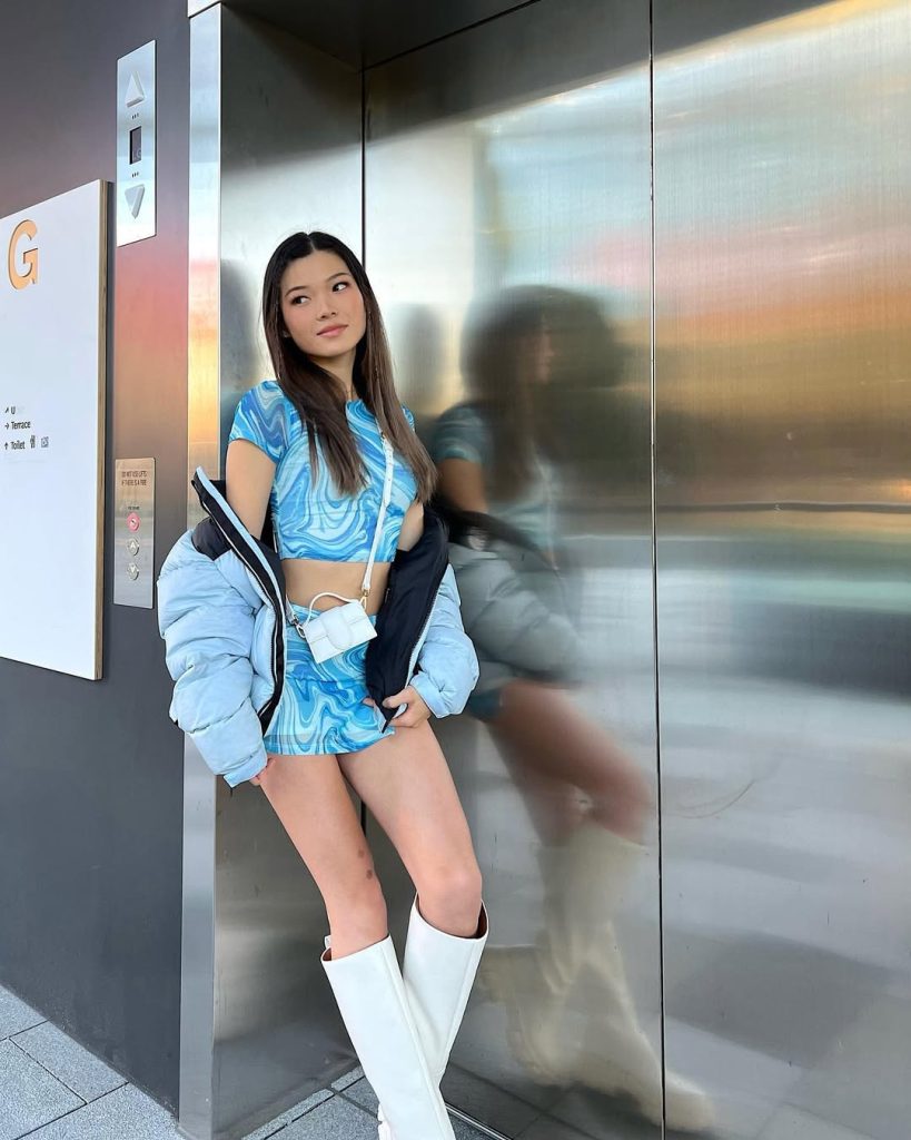 A blue swirl crop top and mini skirt meet an oversized puffer and white boots, blending winter practicality with hot-girl summer print.