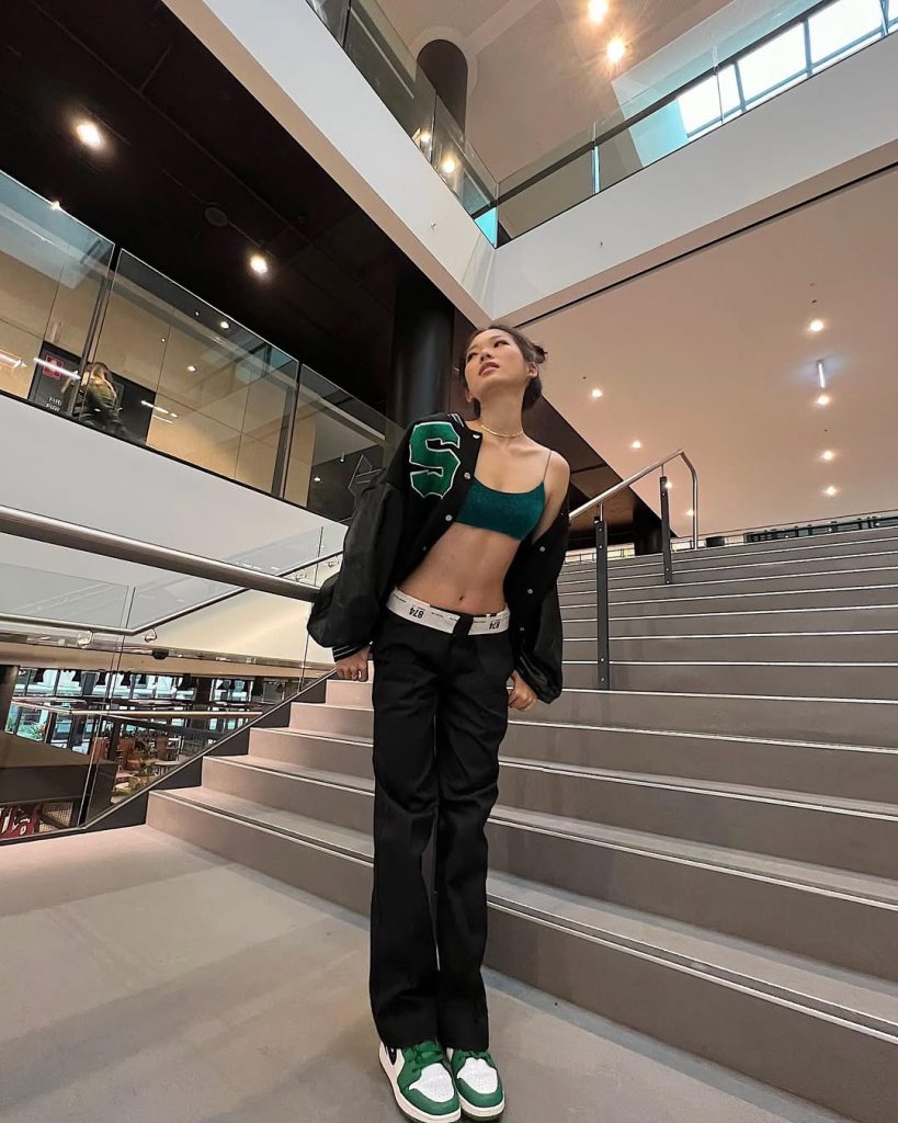 A varsity jacket, green bralette, and relaxed trousers make a sporty baddie uniform that moves seamlessly from school staircases to casual bar nights.
