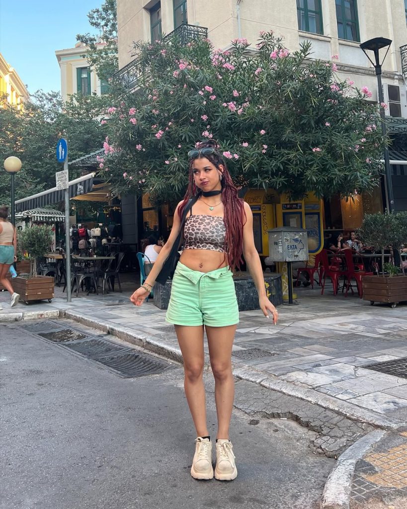 A bold cheetah print bandeau, mint shorts, and chunky sneakers bring a playful edge to a downtown summer look that’s equal parts chill and fearless.