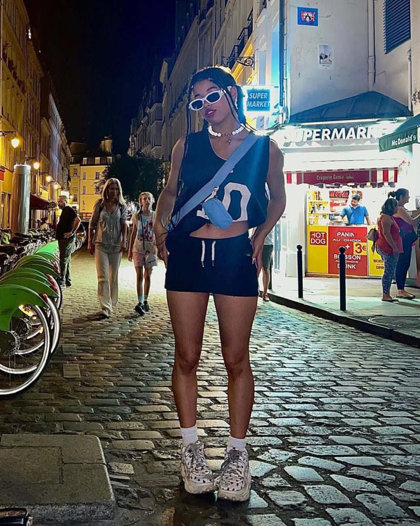 With this look, you can hit up any street with a party where you still might end up dancing. Add personality with layered beaded bracelets or a tiny charm on the bag strap; avoid fussy jackets that hide the strong graphic lines. If you’re styling for school or campus, swap the mini for bike shorts and keep the same top-plus-sneaker formula. For plus-size babes, a boxier tank and A-line skirt in similar fabrics give the same energy with extra comfort.