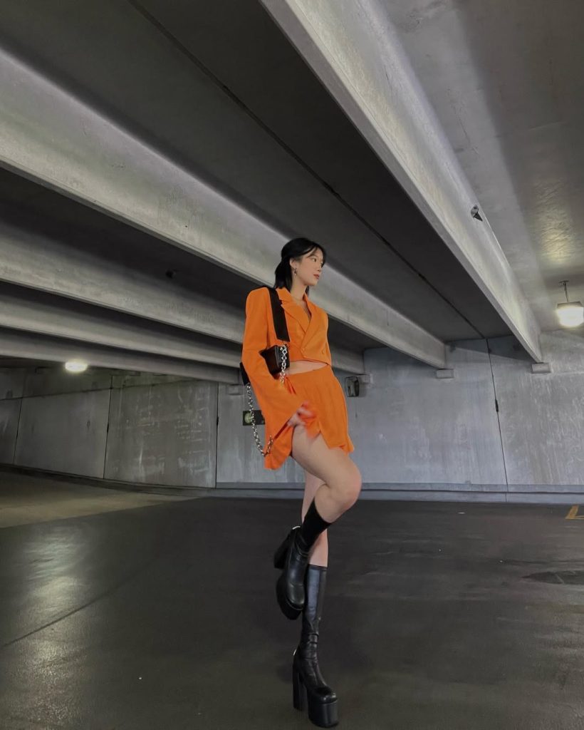 A cropped orange blazer and matching mini skirt create the loudest kind of corporate cosplay—executive realness with platform boots built for after-hours.