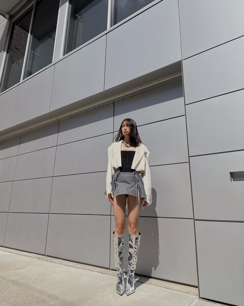 Metallic knee-highs, a corset, and a cropped blazer fuse Y2K futurism with cowgirl swagger—like someone invited a Houston rodeo to a city fashion week.