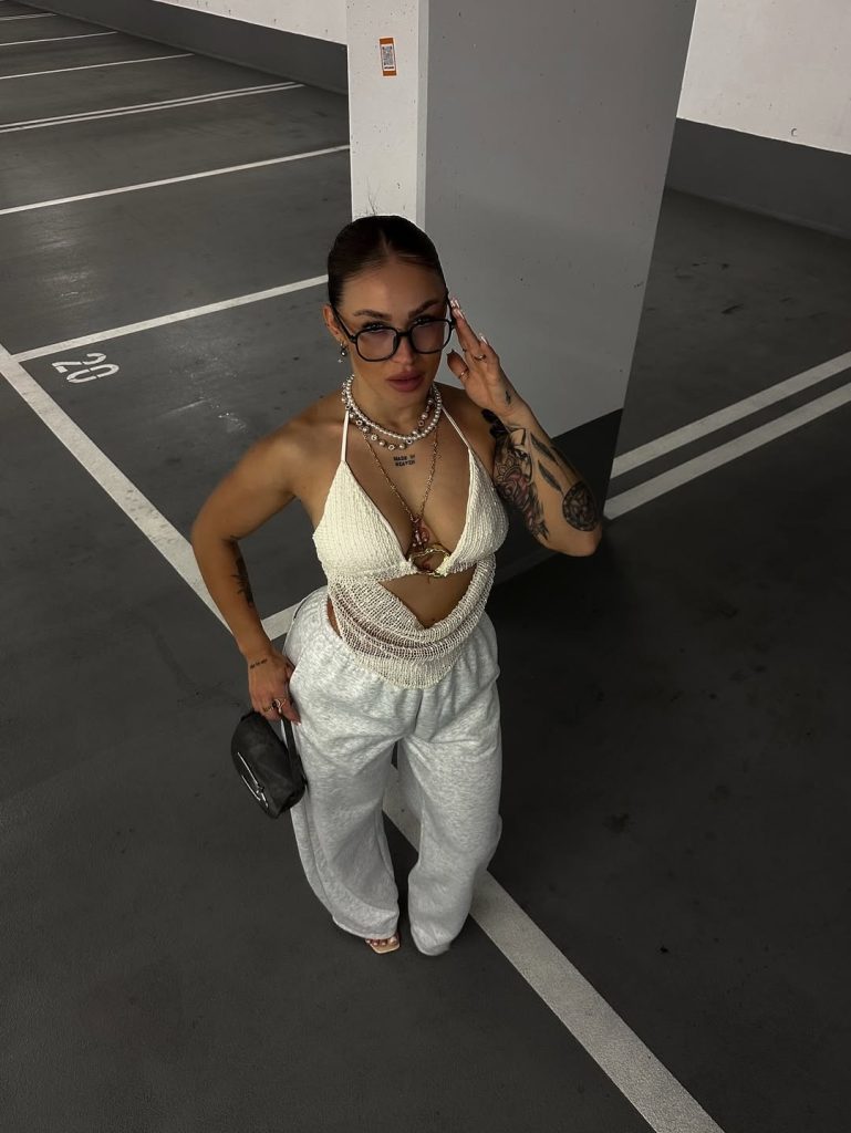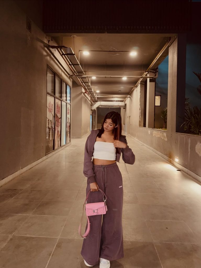 A mauve tracksuit, white bandeau, and pastel bag prove that loungewear can still be a baddie uniform, especially for late-evening errands and quiet corridors.