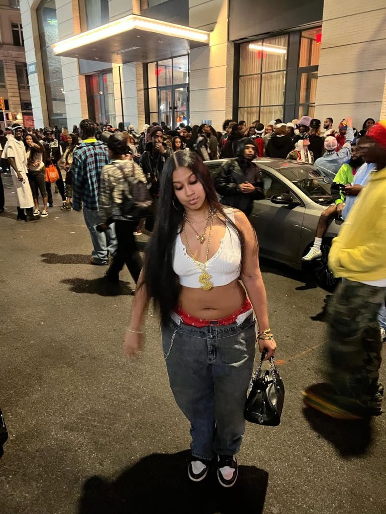 A white ribbed crop top, visible waistband, and baggy jeans embody the true spirit of a street baddie, perfect for a crowded block party night in the city.