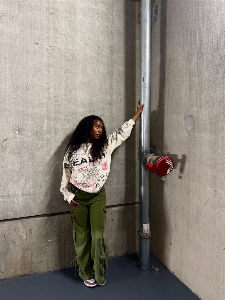 A graffiti-print sweatshirt paired with wide-leg cargos is comfort chill with a fashionable vibe, perfect for concrete garage settings and dimly lit city corners.