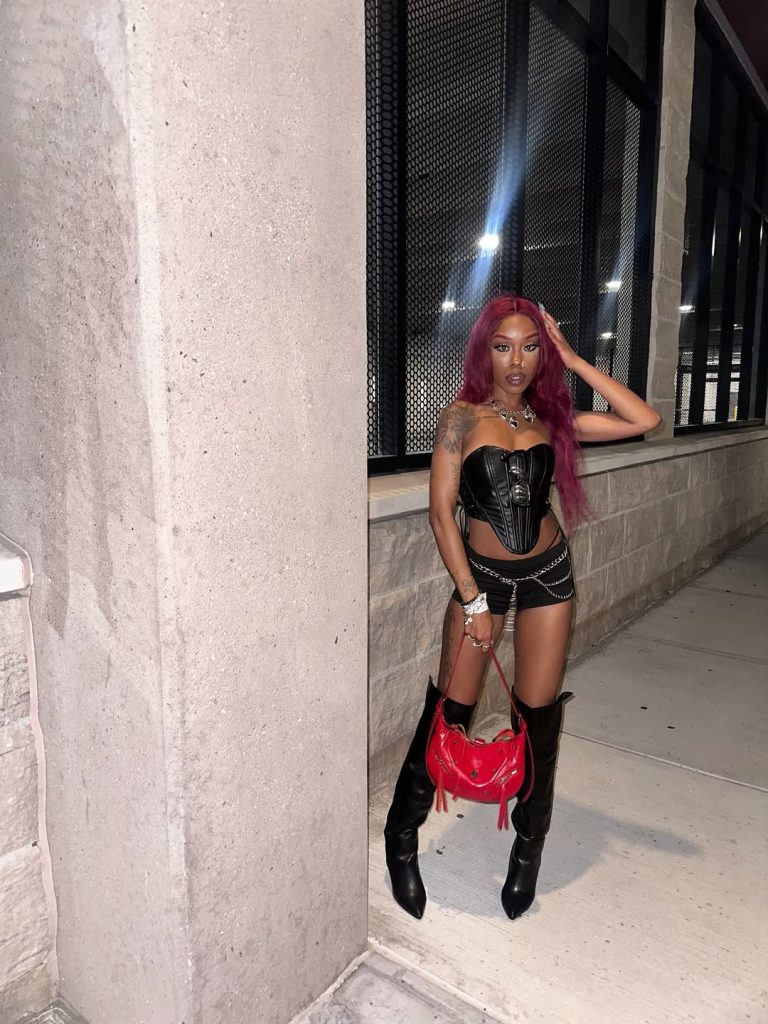 Glossy leather, thigh-high boots, and a fire-engine bag create a nightlife armor that feels straight from a music video or downtown after-party.