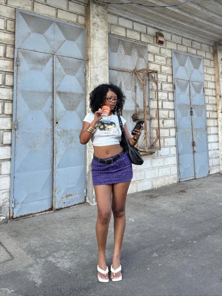 A shrunken graphic tee, lilac mini, and flip-flops capture the carefree Summer baddie spirit, like stepping out for a soda and accidentally serving a look.