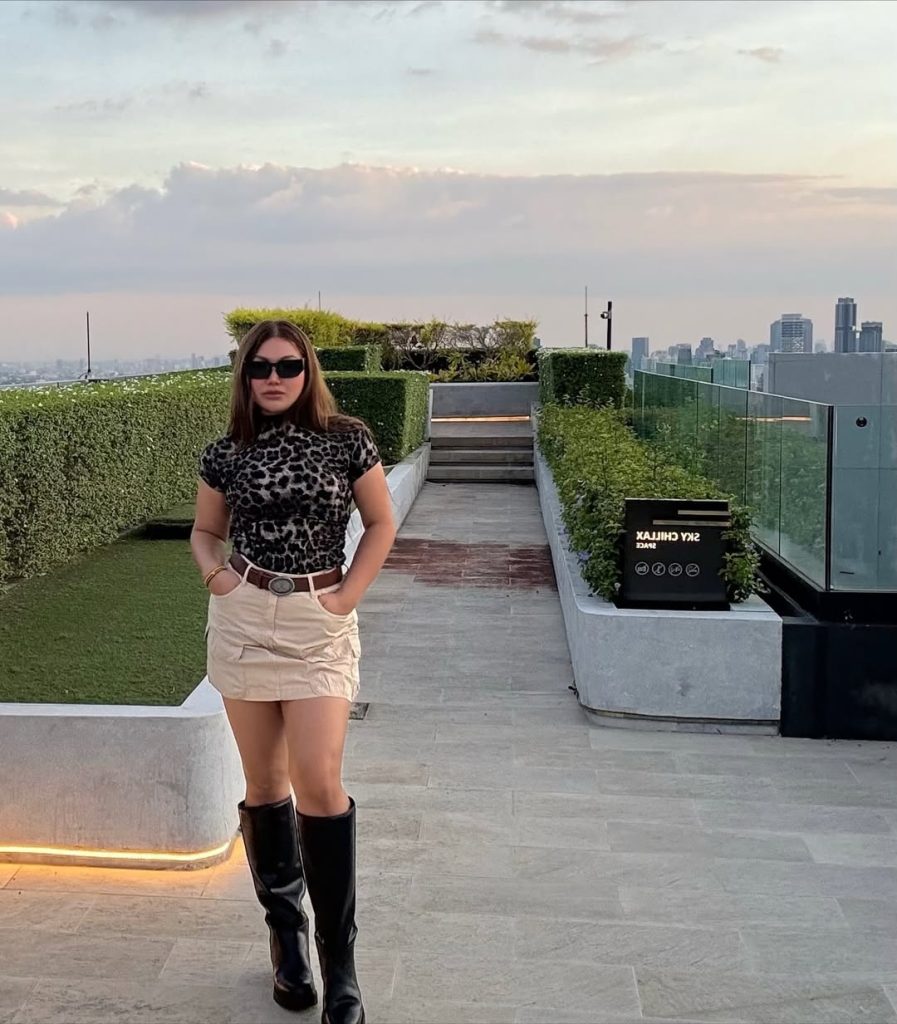 A fitted cheetah-print turtleneck and cream cargo mini skirt bring “city safari” glamour, especially with glossy boots and sunset skyline views.