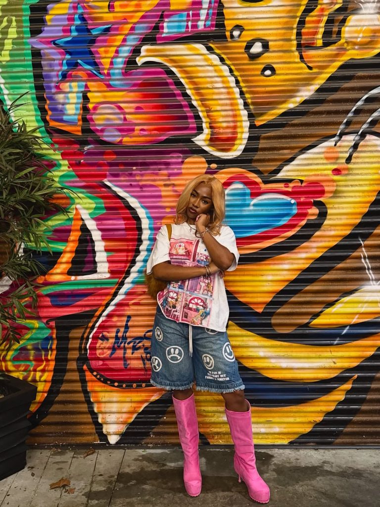 Hot-pink boots, printed Bermudas, and a cartoonish bag turn a graffiti wall into a full-blown outfit backdrop, dripping with playful color.