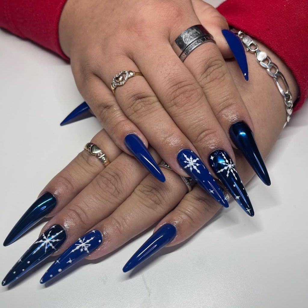 High-gloss cobalt chrome with hand-painted snowflakes puts Art front and center. This is festive without tipping kitsch: glossy icicle shine, white stars, and elongated stilettos.