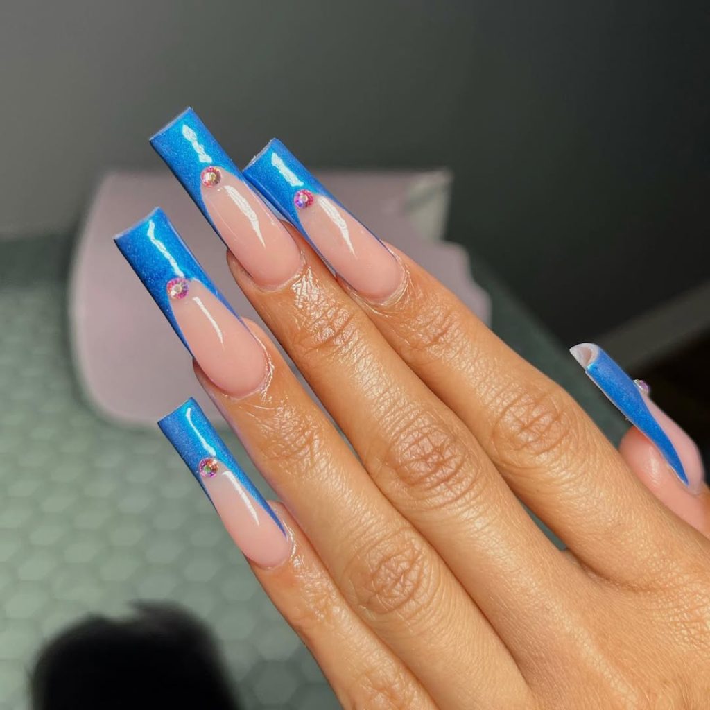 Think modern ballroom: sheer nude base carved with vivid cobalt borders and a tiny crystal at each cuticle. It’s a sleek French tip—but make it Electric . The elongated square silhouette turns every swipe into a flourish.