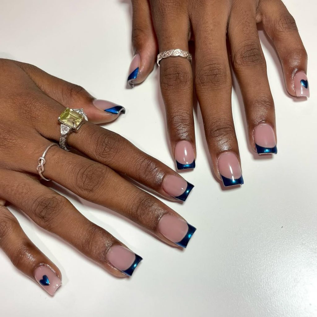 Short square nails with a mirrored Navy chrome French tip and a tiny heart on one finger—proof that minimal with design details read expensive. The negative space elongates the nail bed while staying practical for typing and child-wrangling.