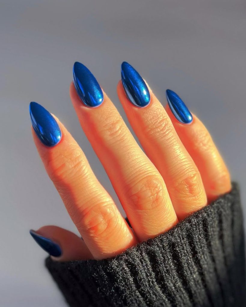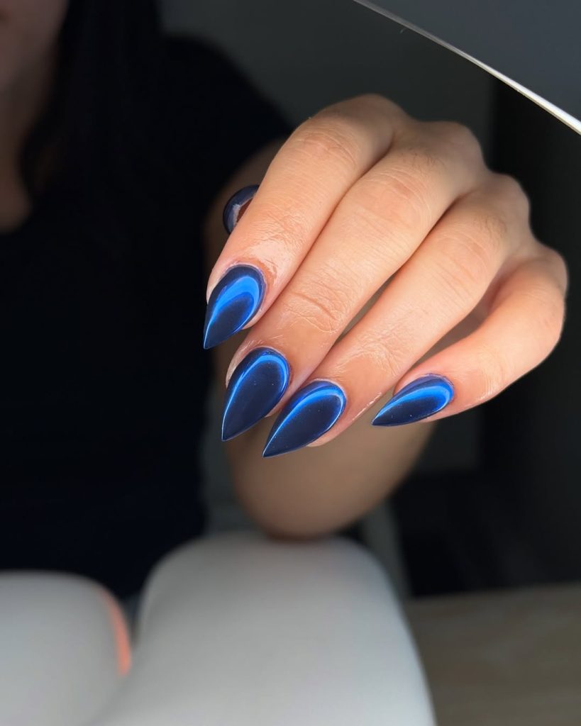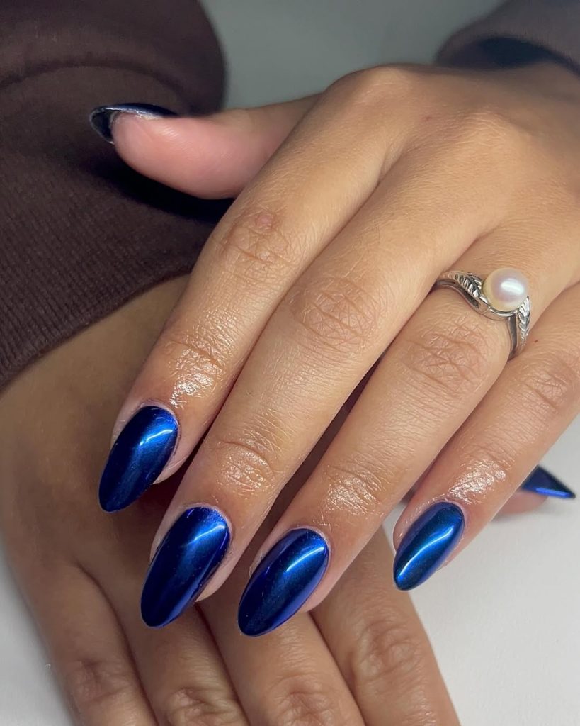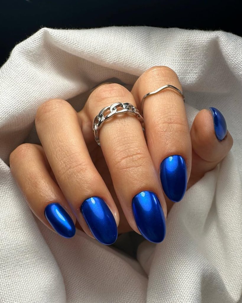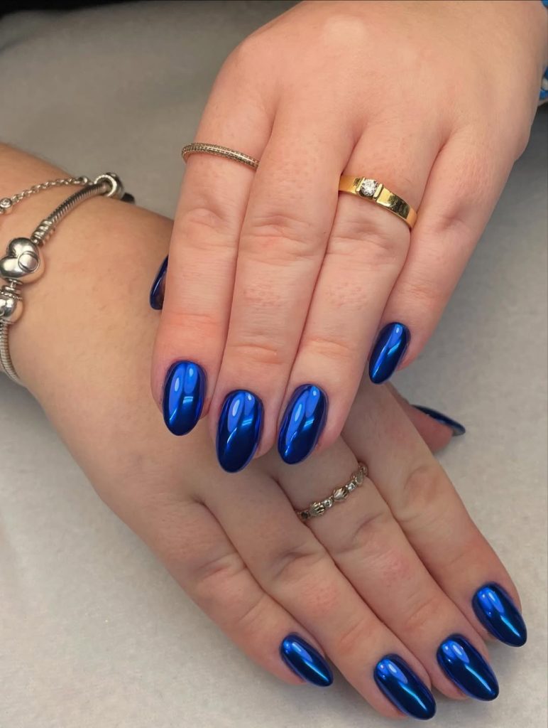 High-shine cobalt on elongated almond nails—photolight bounces off the chrome so the centers glow while the edges deepen, a subtle gradient that hints at Midnight. It’s editorial without being impractical.