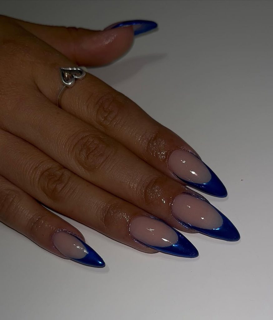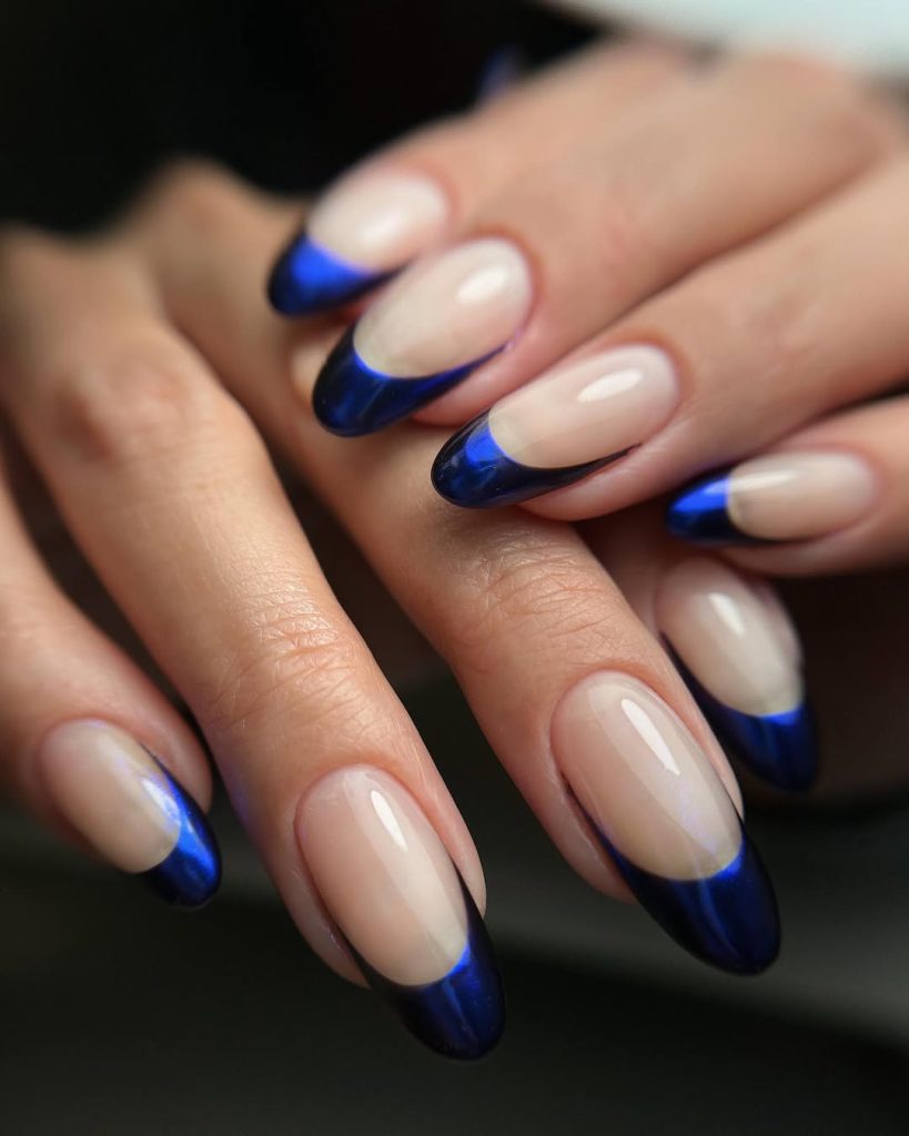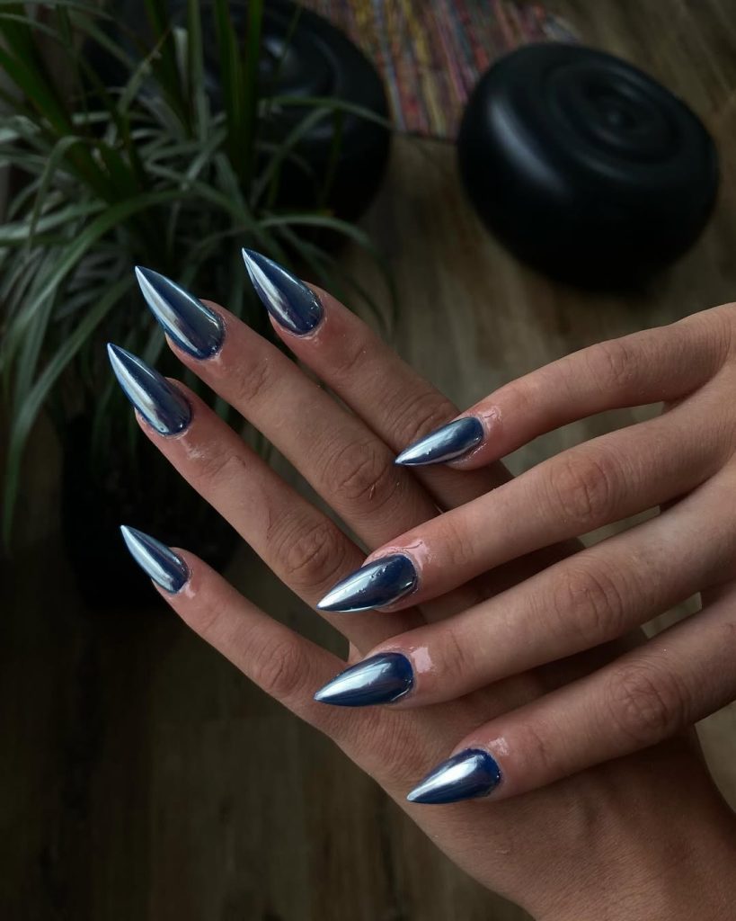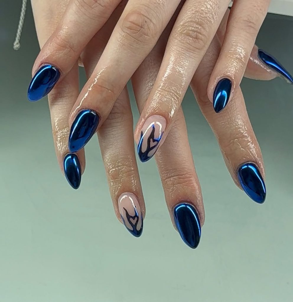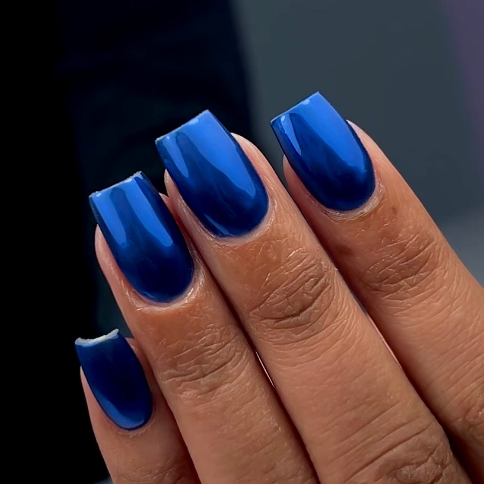 High-shine cobalt on elongated almond nails—photolight bounces off the chrome so the centers glow while the edges deepen, a subtle gradient that hints at Midnight. It’s editorial without being impractical.