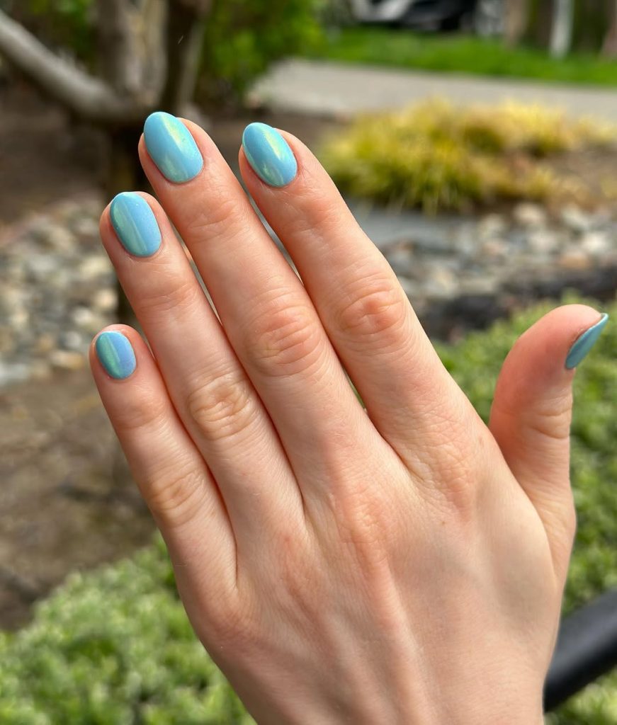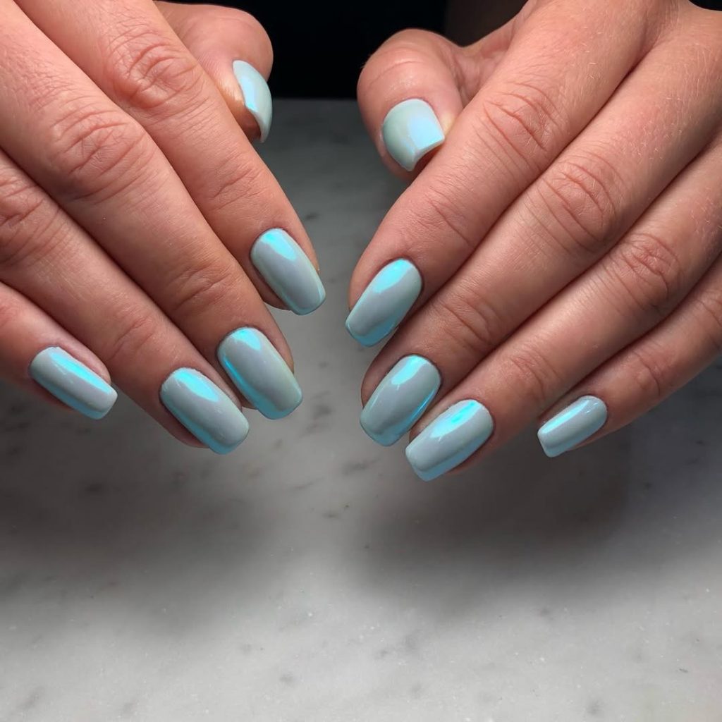 A soft, mirror-washed baby blue reads Light , Pastel , and beautifully Icy —like frost on a window at sunrise. The shape remains practical: modern square edges with a salon-friendly Short length. The chrome finishes Sky tones in daylight and a pale glow in the evening.
