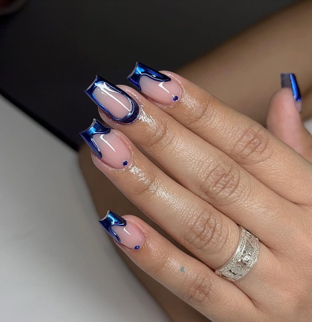 Salon vocabulary: Ask for “chrome cobalt french ” with a neutral jelly base, then “gem accents with design.” You can swap the nude for Pink and sheer if you want a warmer undertone. This set shines for graduations, showers, and midsummer galas—aka peak summer event season. Ideal on acrylic to keep edges razor-sharp and chip-free.