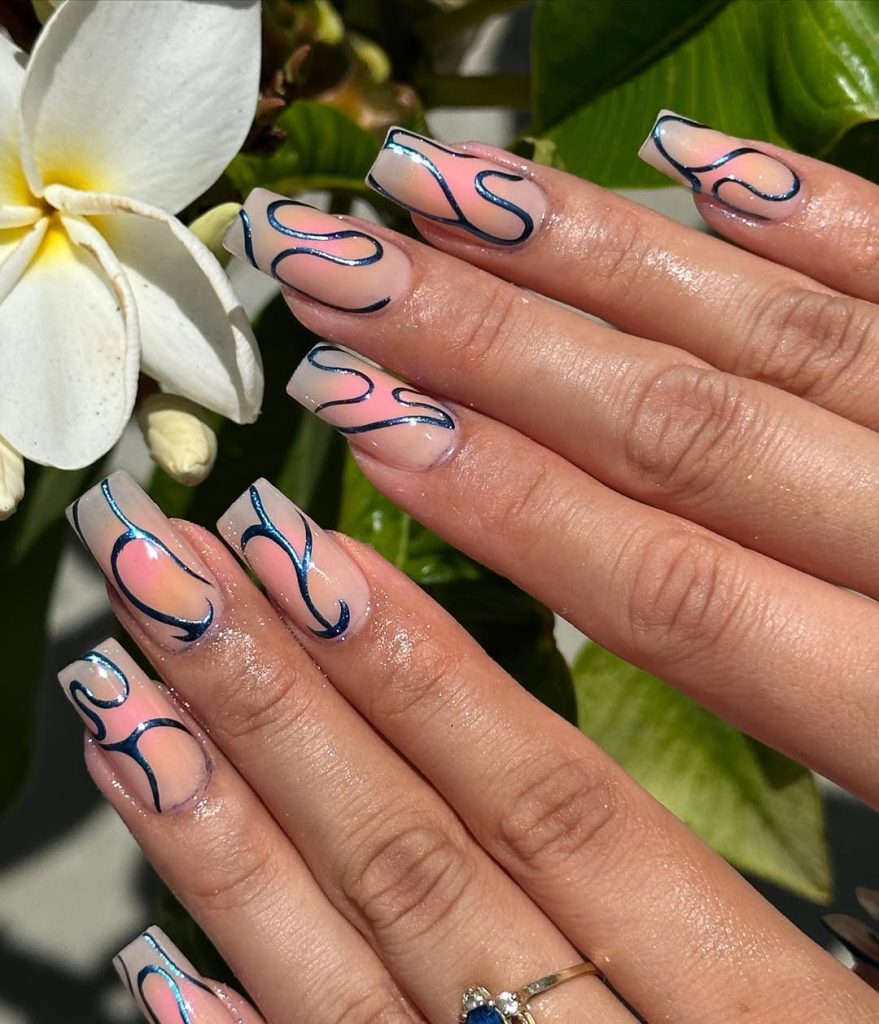 Glossy cobalt outlines swirl over a sheer Pink and neutral base. The graphic lines feel beachy without a literal seashell—editorial Designs that still read desk-appropriate. The long square silhouette elongates the hand and photographs like a dream in sunlight, making it prime for summer designs.
