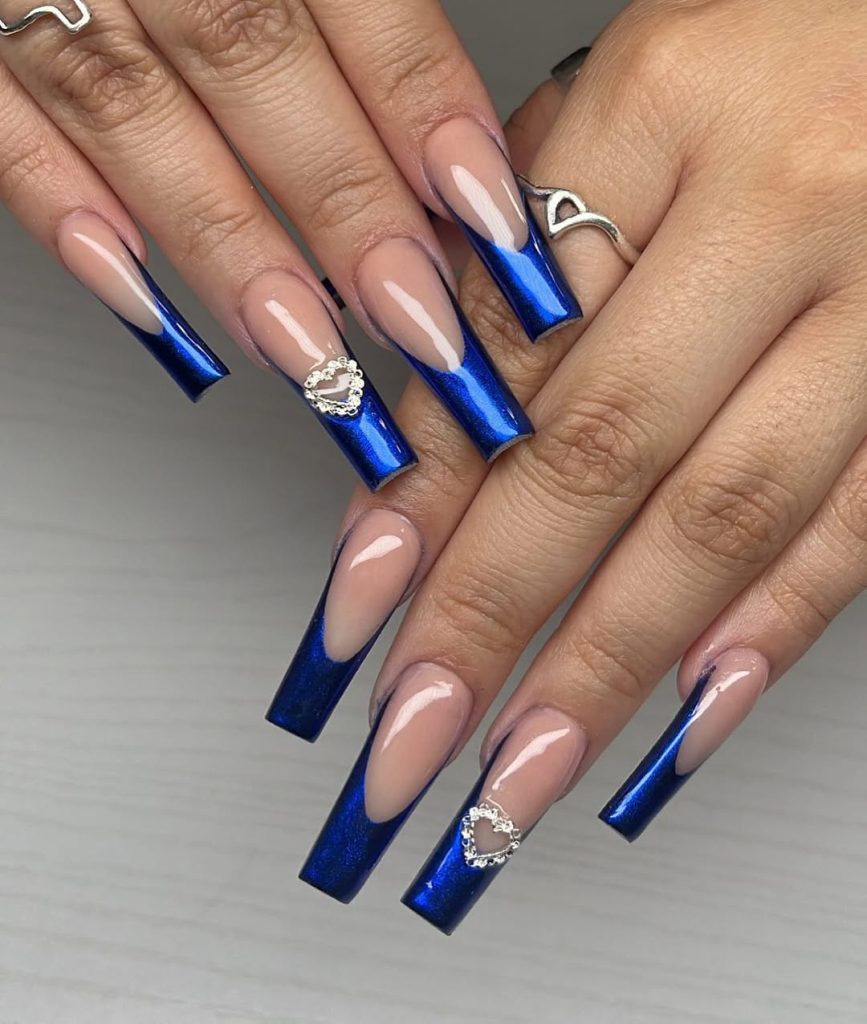A high-beam cobalt French tip on elongated coffin square nails, punctuated by a rhinestone heart. The look bridges classic and modern— Royal blue polish meets jewelry-level shine. The sculpted length is best on acrylic for that razor edge.
