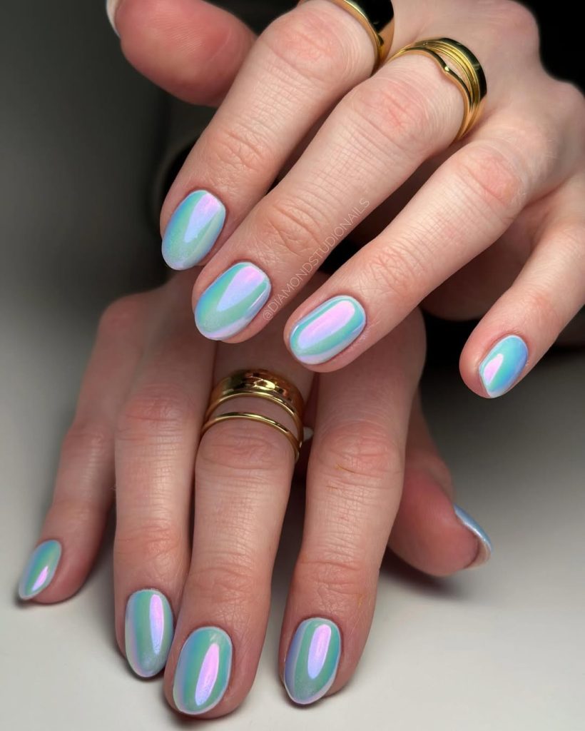 A softer mood: chromed turquoise that moves between mint and lilac—an Icy , Pastel gradient that feels like sea glass. The length is Short and rounded, friendly for keyboards and kiddo zippers.