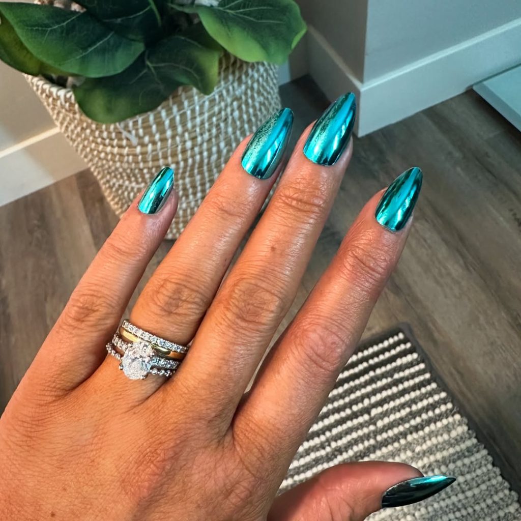 We shift toward teal—a blue-green chrome that screams resort cocktails at 6 p.m. The nails are long almond , a little extra, yet still practical for travel snaps and clinking glasses.