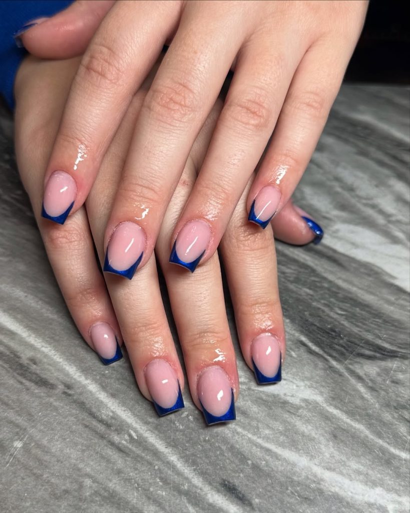 If you love clean lines, this one’s for you: a sheer, Pale nude base with crisp cobalt French tip on softly square nails. It’s the “polished professional” answer to chrome—playful but board-approved.