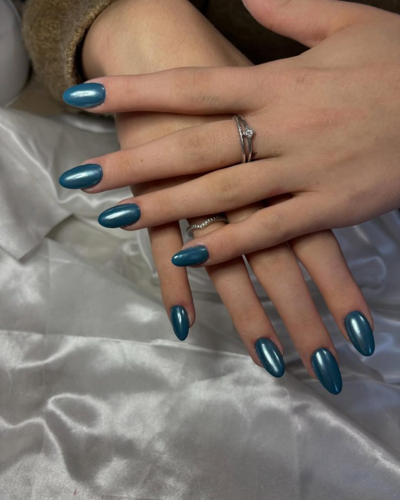 A serene teal chrome with a soft-satin sheen—cool enough to feel Icy , yet warm enough to flatter everyday jewelry. The tapered shape leans toward almond , giving hands that elongated, elegant line without the maintenance of talons. It’s the perfect “weekday elevated” choice for women who want color—just not shouty color.