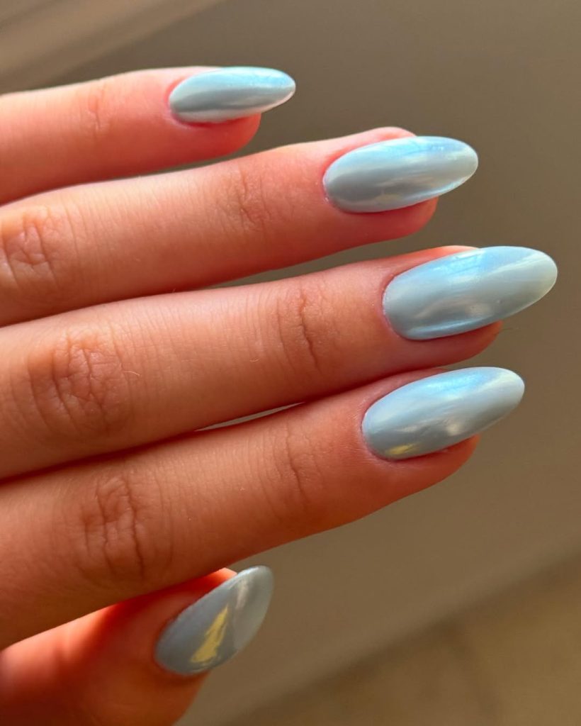 Salon script: Ask for a sheer baby-blue gel topped with chrome powder, finished in a rounded oval. If you like a slightly Dusty undertone, your tech can mix a drop of grey into the base for a grown-up sky blue.