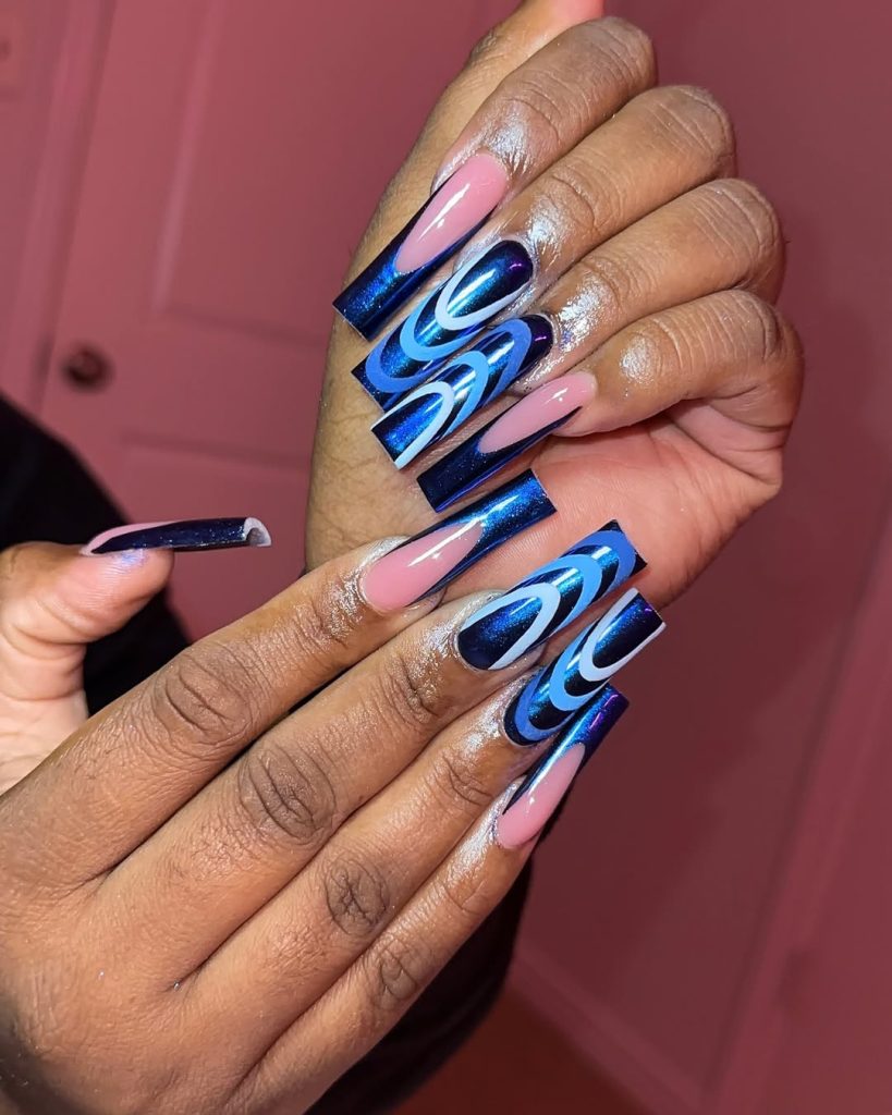 Salon script: cobalt chrome base, layered swoops with design in pale and navy tones on acrylic extensions for crisp edges. This set lands squarely in designs summer —bold for vacations, festivals, and any night that involves a flash photo. The undertone leans Navy , and the chrome flare adds that hit of Electric shine.