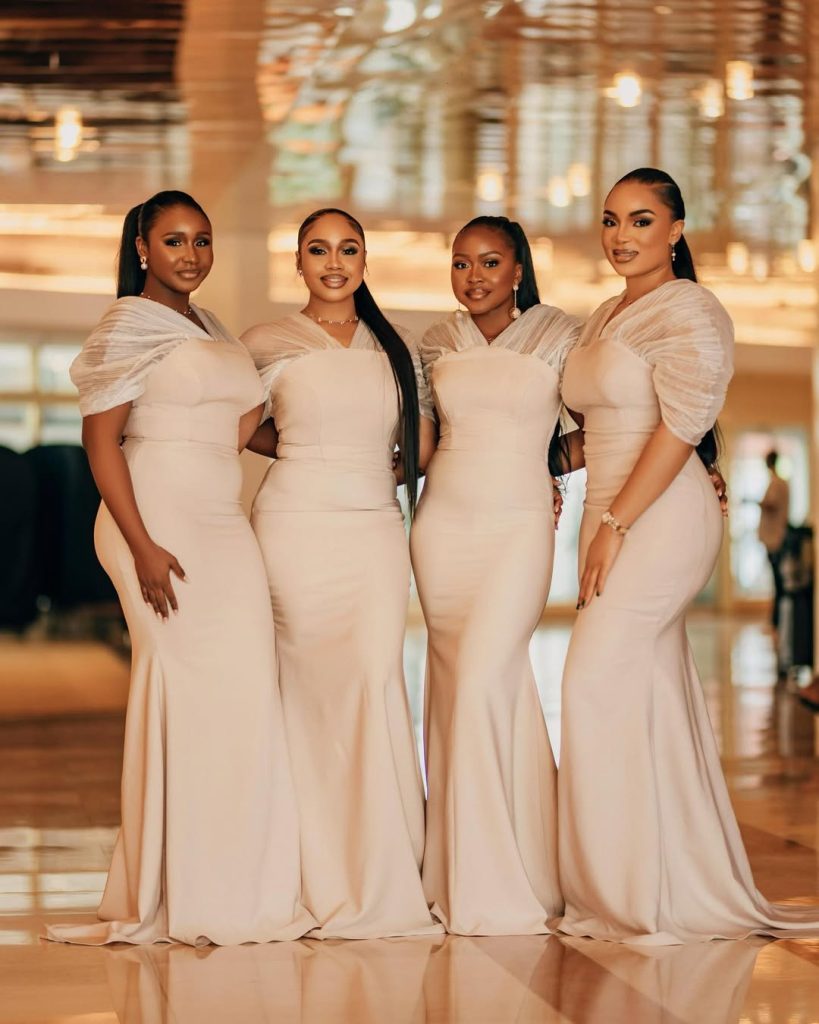 This look sings in grand hotel ballrooms or modern churches, and it’s a thoughtful option when bridesmaids want a bit more coverage without losing shape. It also works beautifully alongside a bride in gold-trimmed or beaded details. To individualize, each bridesmaid can choose different hairstyles—slick ponytails, low buns, or Hollywood waves—while the dresses keep the group cohesive. I’d avoid adding boleros or extra wraps; the sheer sleeves already create a built-in statement. Instead, focus on refined makeup and perhaps pearly hairpins to echo the soft sheen of the overlay.