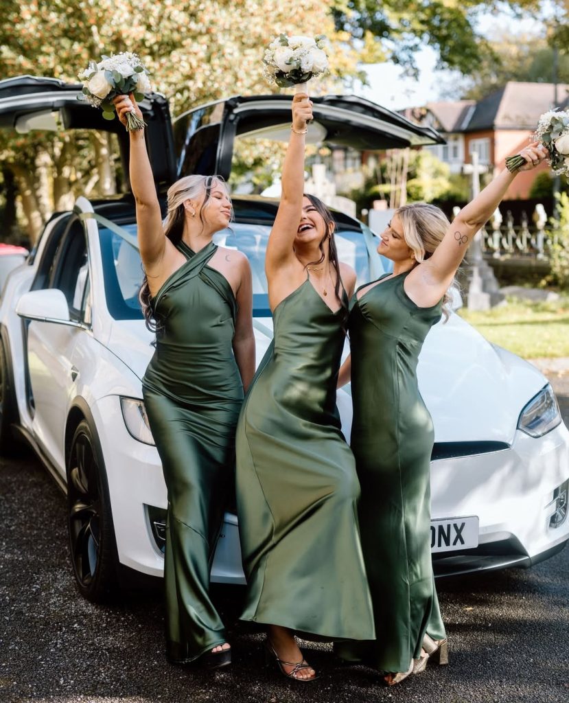 A trio of rich green gowns in glossy satin proves that bridesmaids can be both coordinated and utterly joyful, capturing that “champagne-popping in the driveway” energy.
