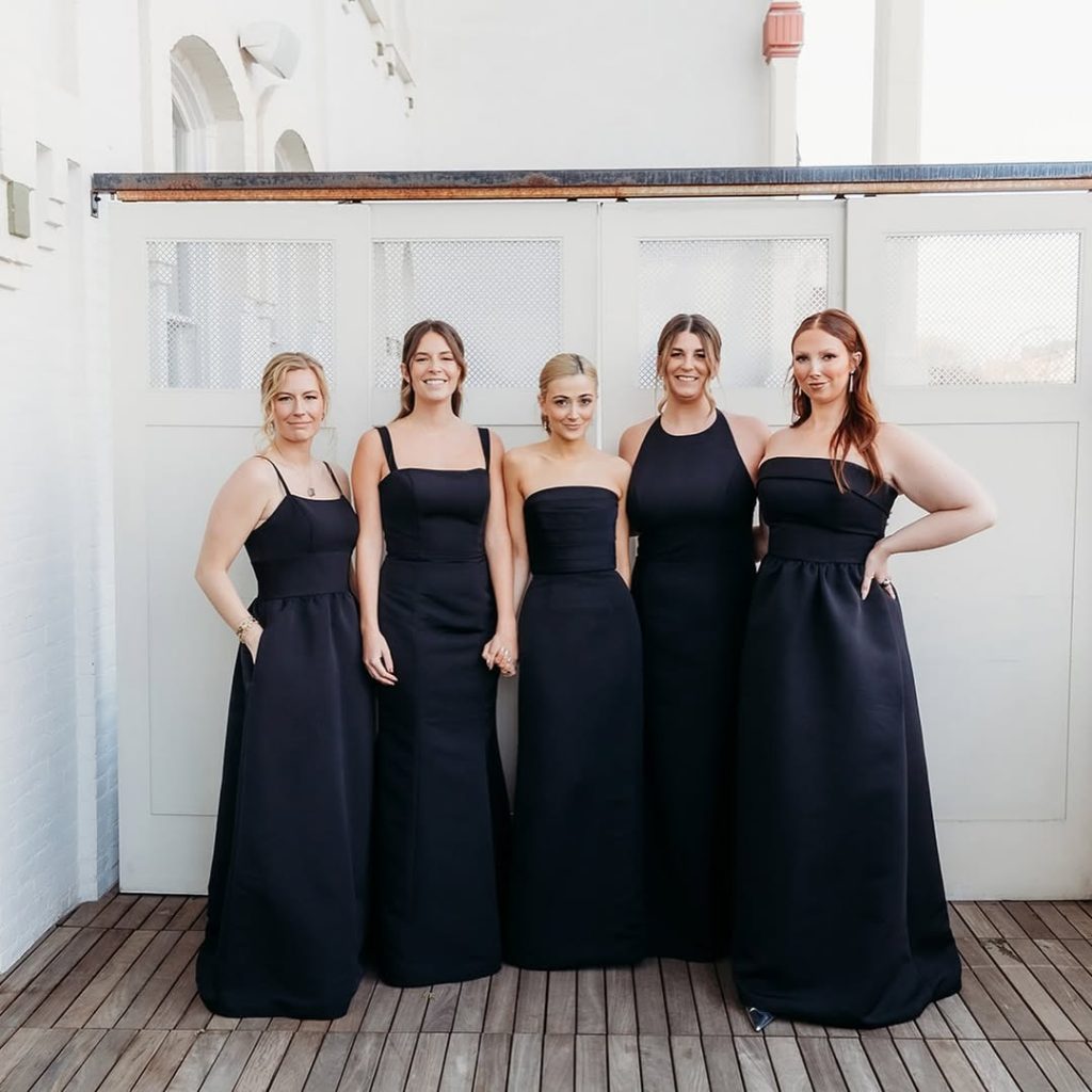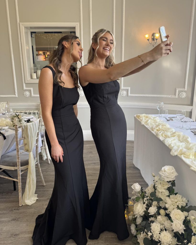 Here, matching black column gowns turn a candid moment into a frame-worthy shot, balancing effortless fun with quietly structured elegance.
