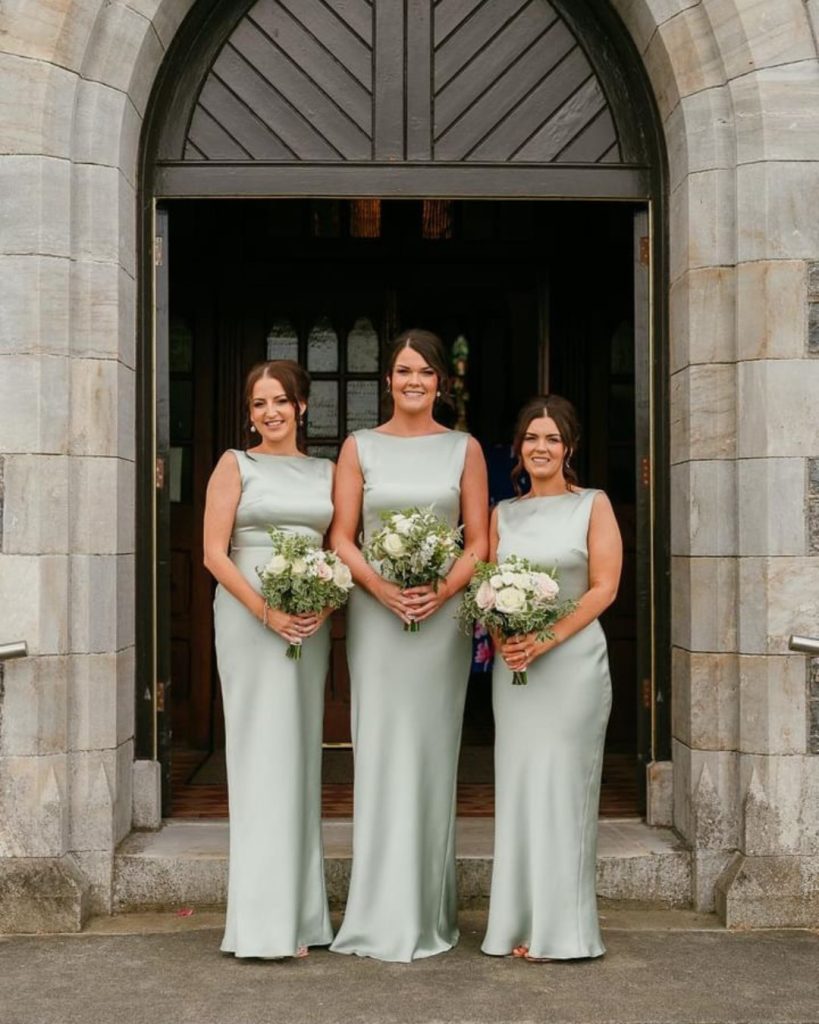 Soft Sage Satin: Calm Elegance at the Church Doors