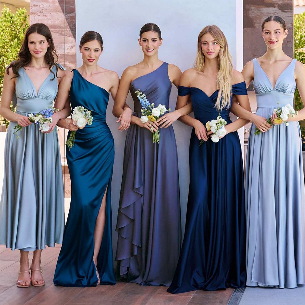 A lineup of gowns in layered blue tones shows how a mismatched palette can still feel curated, like a wave of color rolling through the ceremony.