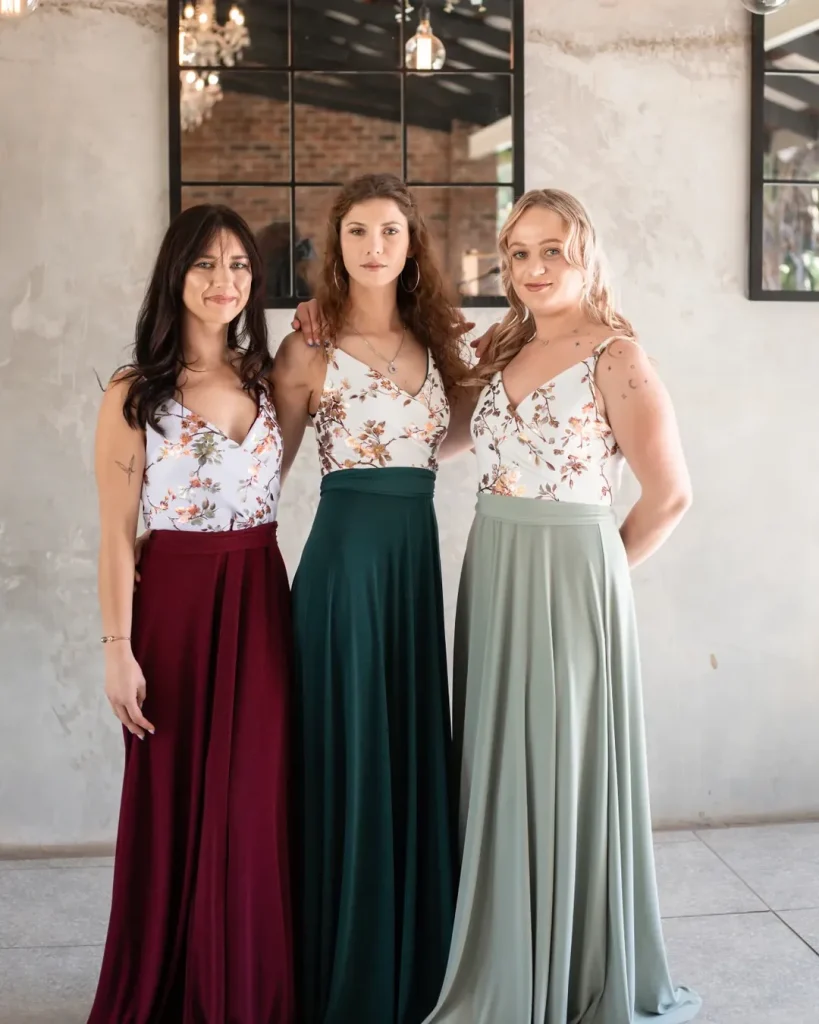 Floral tops paired with flowing skirts in burgundy, forest, and sage green bring a laid-back, boho twist to bridesmaid style while still feeling coordinated.