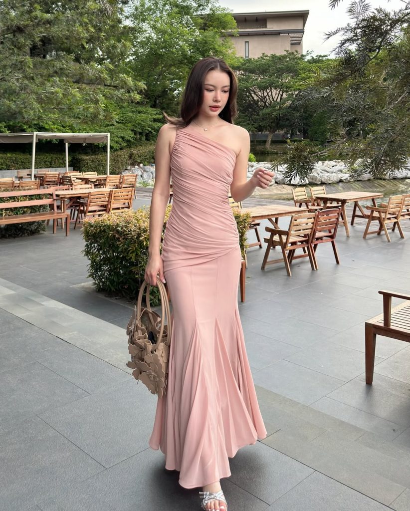 - Floor-length blush Pastel dress with one-shoulder neckline