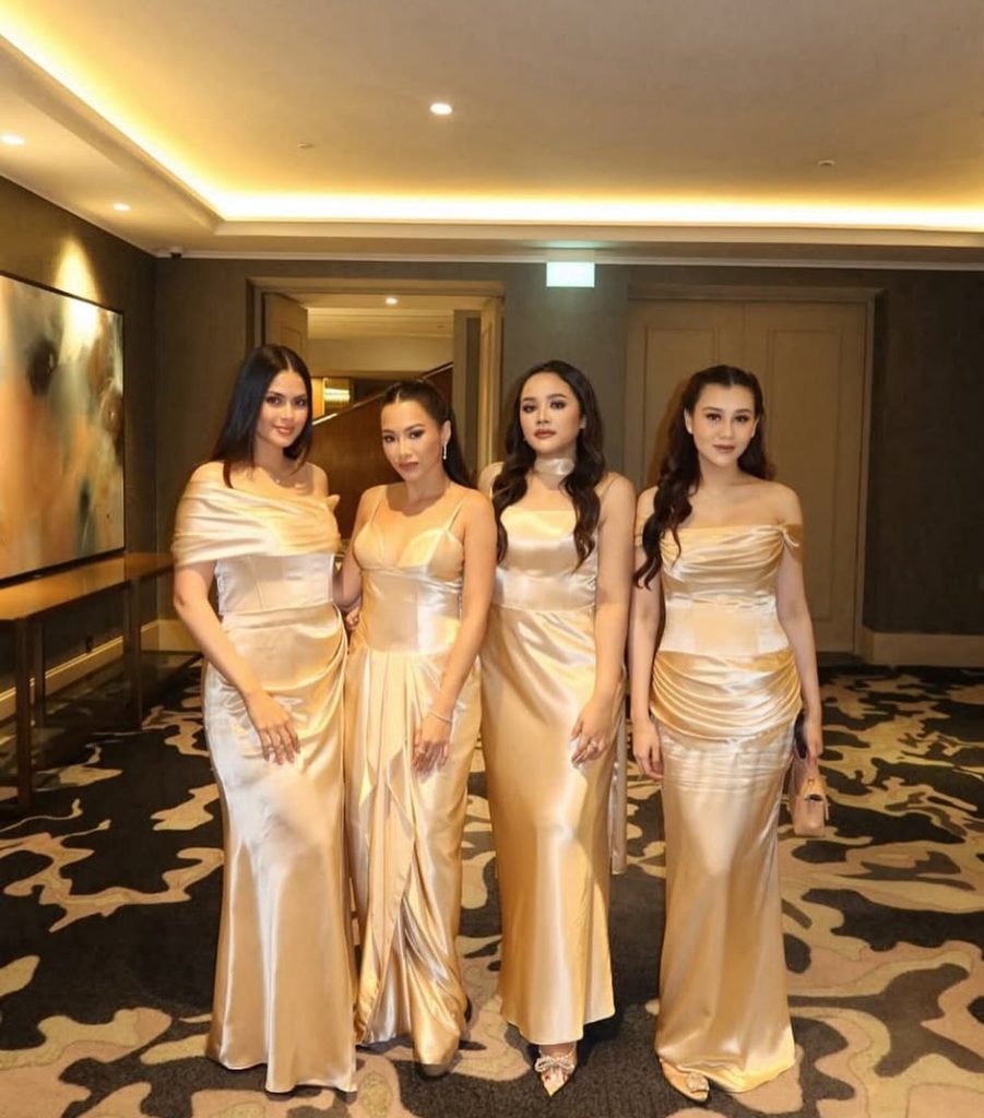 These gowns shine at evening wedding receptions, courtyard venues, or heritage estates where the architecture is as striking as the dresses. To add personality, play with different hairstyles—one bridesmaid in long, loose waves, another in a chic blowout—while keeping jewelry consistent in silver or gold. I’d avoid adding shrugs or cardigans; they interrupt the clean off-shoulder line. A soft smoky eye and neutral lip keep the focus on the rich colors and dramatic neckline.