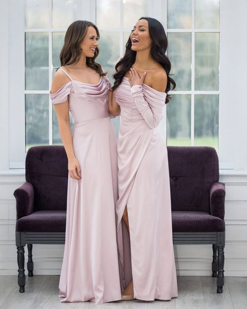A matched pair of rose-mauve gowns in liquid satin brings a subtle Old Hollywood glow, polished yet easy for a modern bridal party.