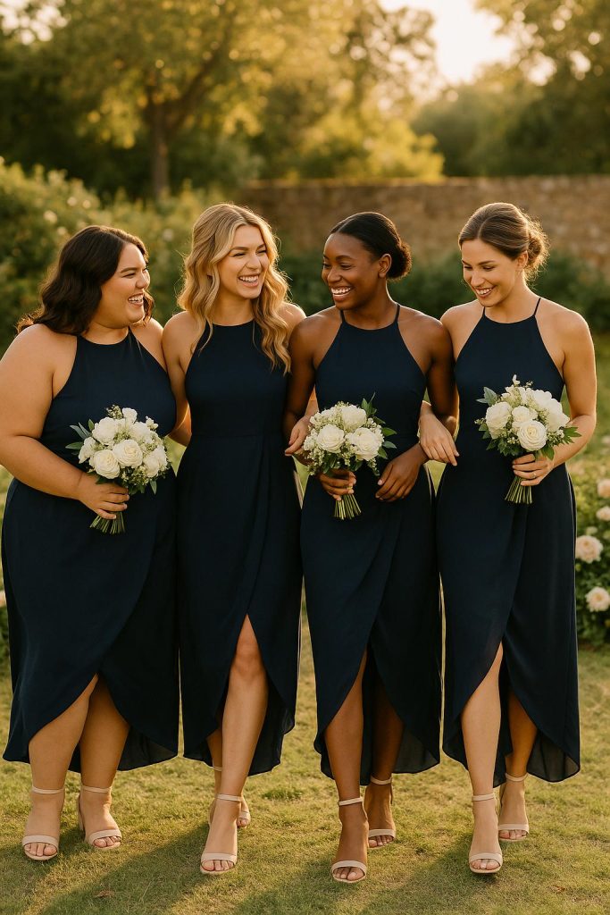 Coordinated navy halter dresses offer a relaxed, modern uniform that flatters different figures while keeping the bridal party polished and joyful.