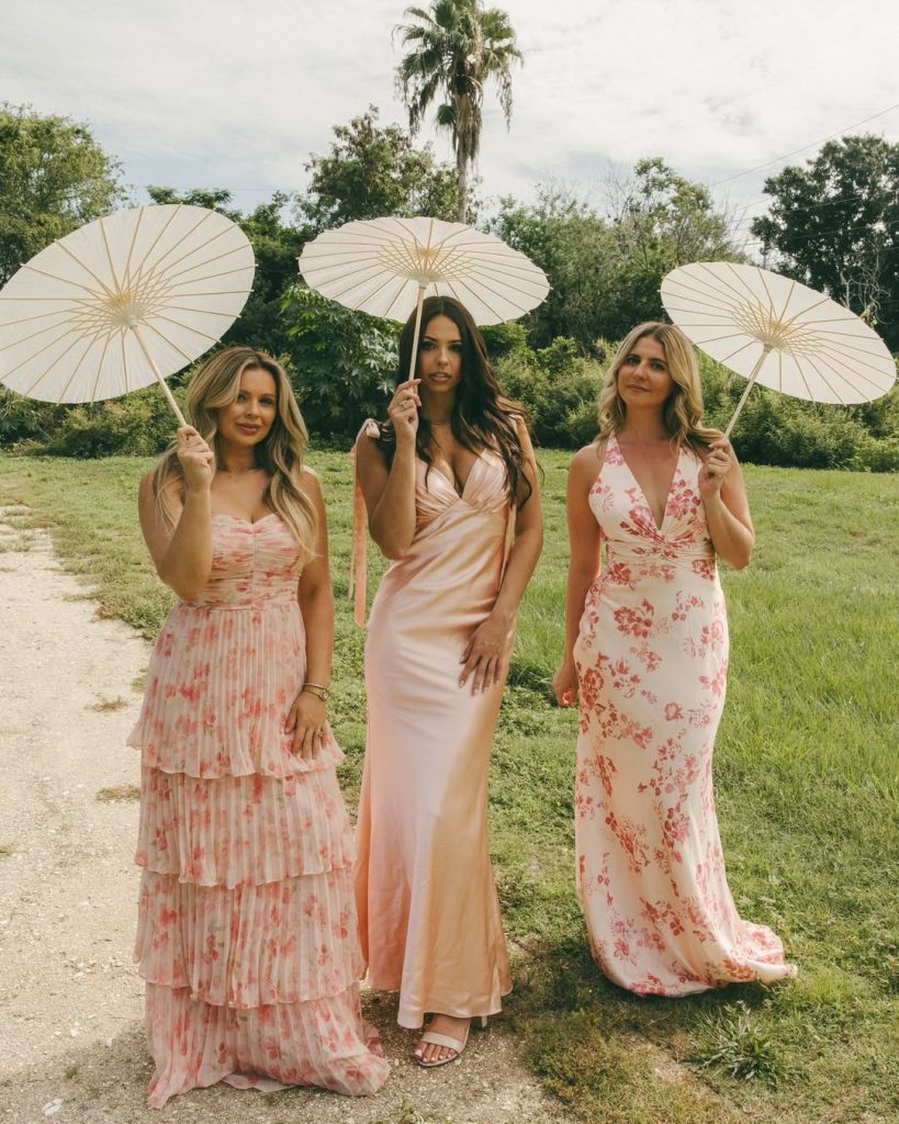 A trio of flowing dresses in pastel peach and floral pink captures a whimsical, almost storybook energy—ideal for sunlit ceremonies and carefree receptions.