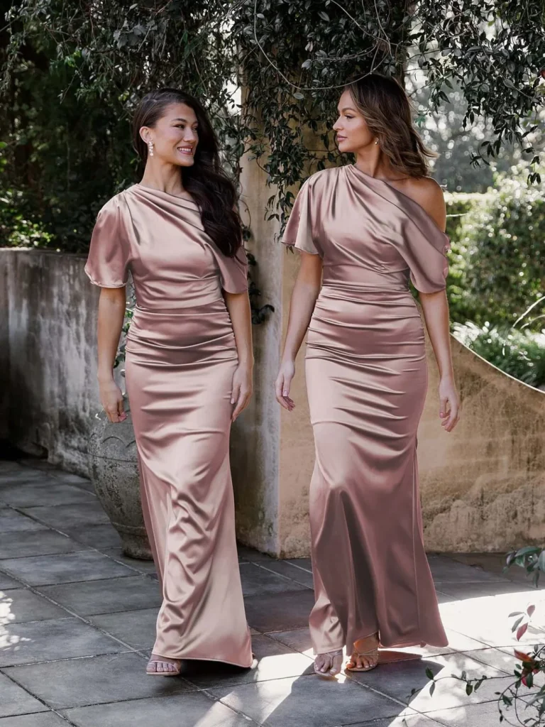 These dresses are perfect for courtyard receptions, city rooftops, or any wedding where the couple leans into understated glamour. To individualize, allow each bridesmaid to choose her neckline while staying in the same fabric—an elegant nod to the mismatched trend. I’d skip chunky necklaces or bold belts; the draping already does the work. A soft smoky eye, glossed lips, and brushed-out curls finish the look beautifully.