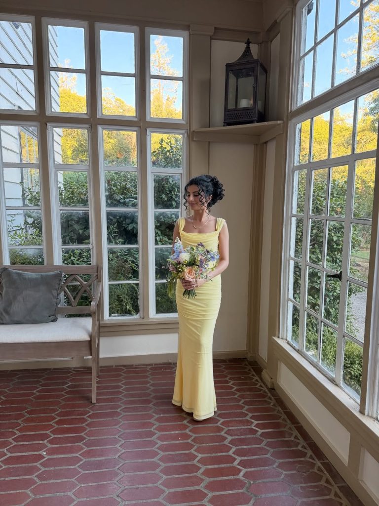 A slim column in butter yellow turns one bridesmaid into a ray of sunlight, brightening the room while still remaining softly elegant.