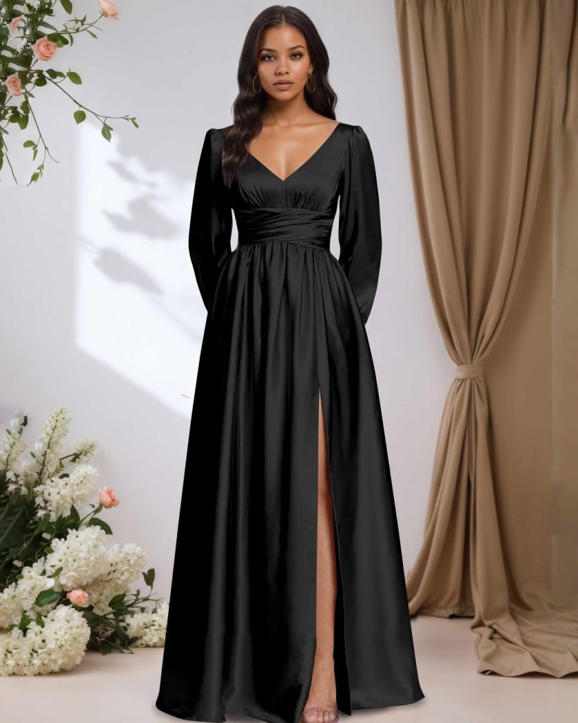 A sweeping black gown in glossy fabric, complete with sleeves, offers a dramatic evening presence while remaining timelessly elegant.