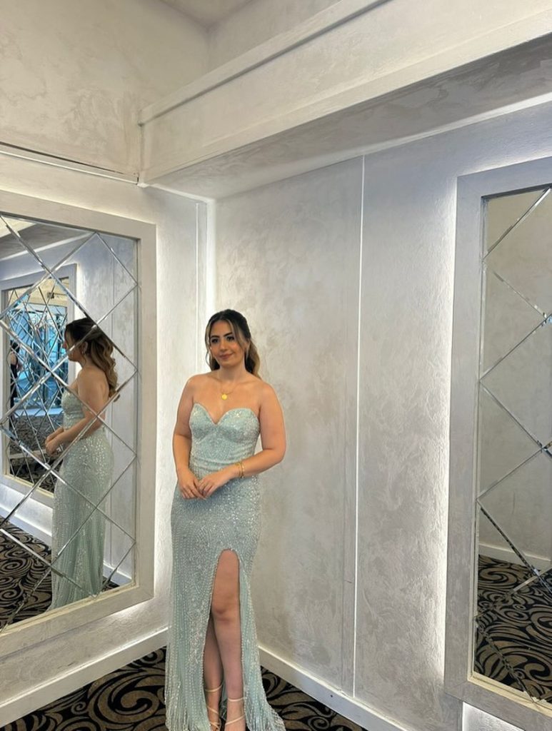 This gown is perfect for evening wedding receptions, hotel ballrooms, or New Year’s “I do’s,” where sparkle is absolutely encouraged. To add personality, keep hair softly waved or pulled into a half-up style so the neckline remains open. I’d avoid large statement necklaces or vibrant colors in accessories; the intricate beading already provides plenty of interest. A cool-toned highlight and soft nude lip keep the overall look refined and camera-ready.
