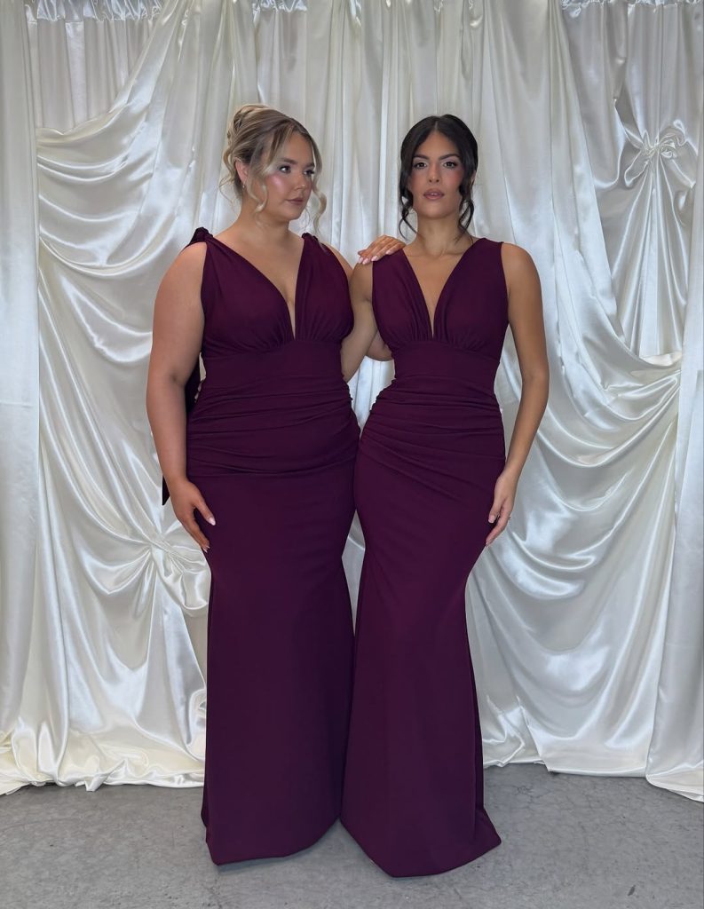 Twin gowns in deep burgundy bring a lush, jewel-toned drama that feels tailor-made for candlelit ceremonies and autumn receptions.