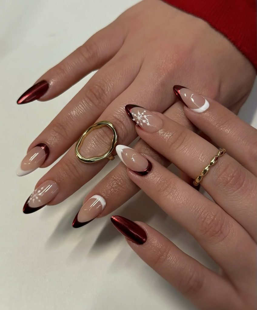 If classic French is your comfort zone, this version nudges it into 2025 with molten-cranberry chrome tips, micro-moon cuticles, and delicate White snowflakes. The elongated almond shape reads long even on medium nails, flattering every hand and giving instant evening energy. I love how the crisp negative space keeps the Red from overwhelming holiday outfits—especially if you’re wearing a jewel-tone slip or a black blazer.