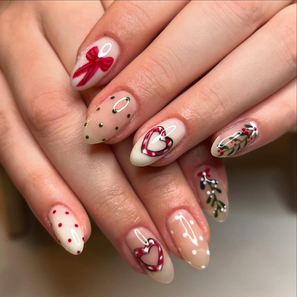 A playful medley of tiny holly sprigs, a glossy ribbon bow, dotted nails, and candy-striped hearts—this set is holiday cheer bottled up. The shorter almond silhouette keeps it Cute and Short, while the palette leans classic Red and green with creamy neutrals to ground everything.