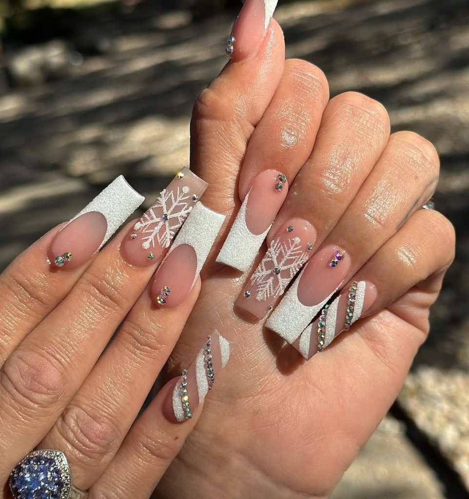 For the glam squad: frosted snowy tips, oversized snowflake etching, and crystal ribbons racing diagonally across a coffin shape. The result is winter-resort luxe—like fresh powder under lodge lights. The length is decisively long, which elongates fingers and photographs like a dream with champagne flutes.